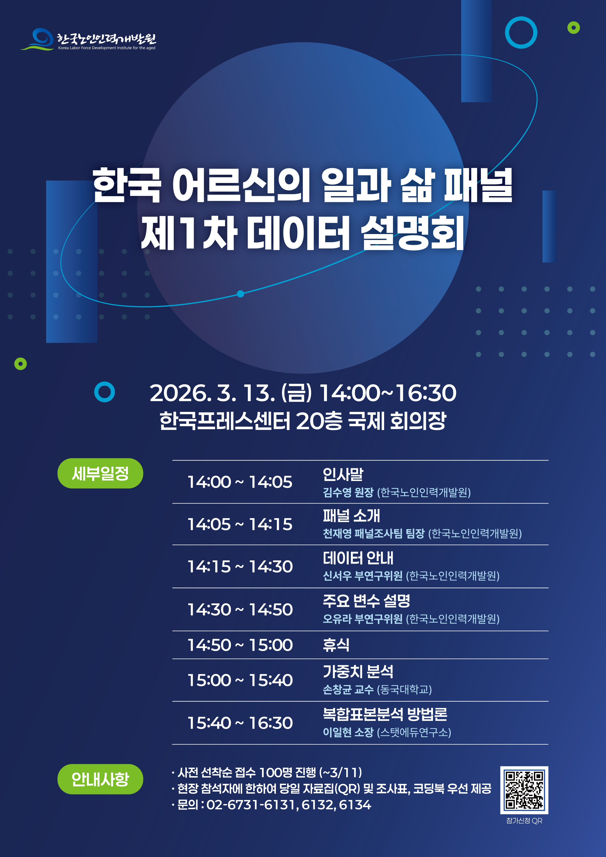 이와 관련하여 패널에 대한 이해를 높이고 데이터 활용을 확대하고자 「2026년 한국 어르신의 일과 삶 패널(KSWL) 제1차 데이터 설명회」를 다음과 같이 개최합니다.